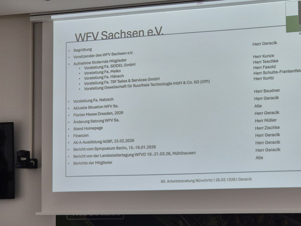 Ein besonderer Höhepunkt war die einstimmige Aufnahme neuer fördernder Mitglieder in den WFV Sachsen e.V. Wir freuen uns sehr, die Firmen SEIDEL, Meiko und Hänsch in unseren Reihen begrüßen zu dürfen. Die persönlichen Vorstellungen durch Herrn Kunze, Herrn Teschke und Herrn Fasold gaben einen interessanten Einblick in die Leistungen der Unternehmen. Auch die Firma Netzsch, vorgestellt durch Herrn Baudner, zeigte ihr Interesse am Verband.